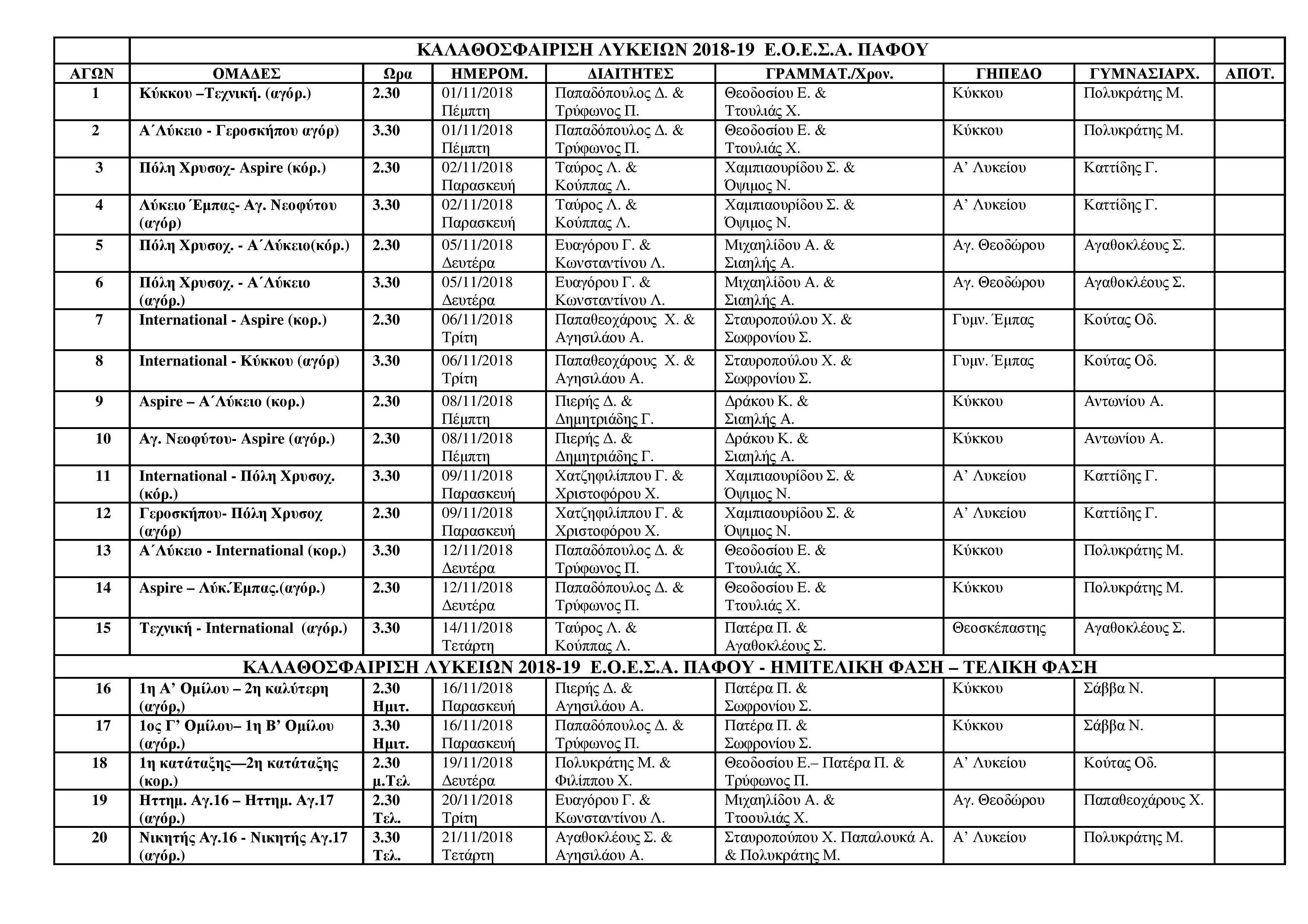 | Πέμπτη 08/11/18 | Αγ. Νεοφύτου - Aspire (20-0) | Aspire - Α' Λύκειο (20-0) |
