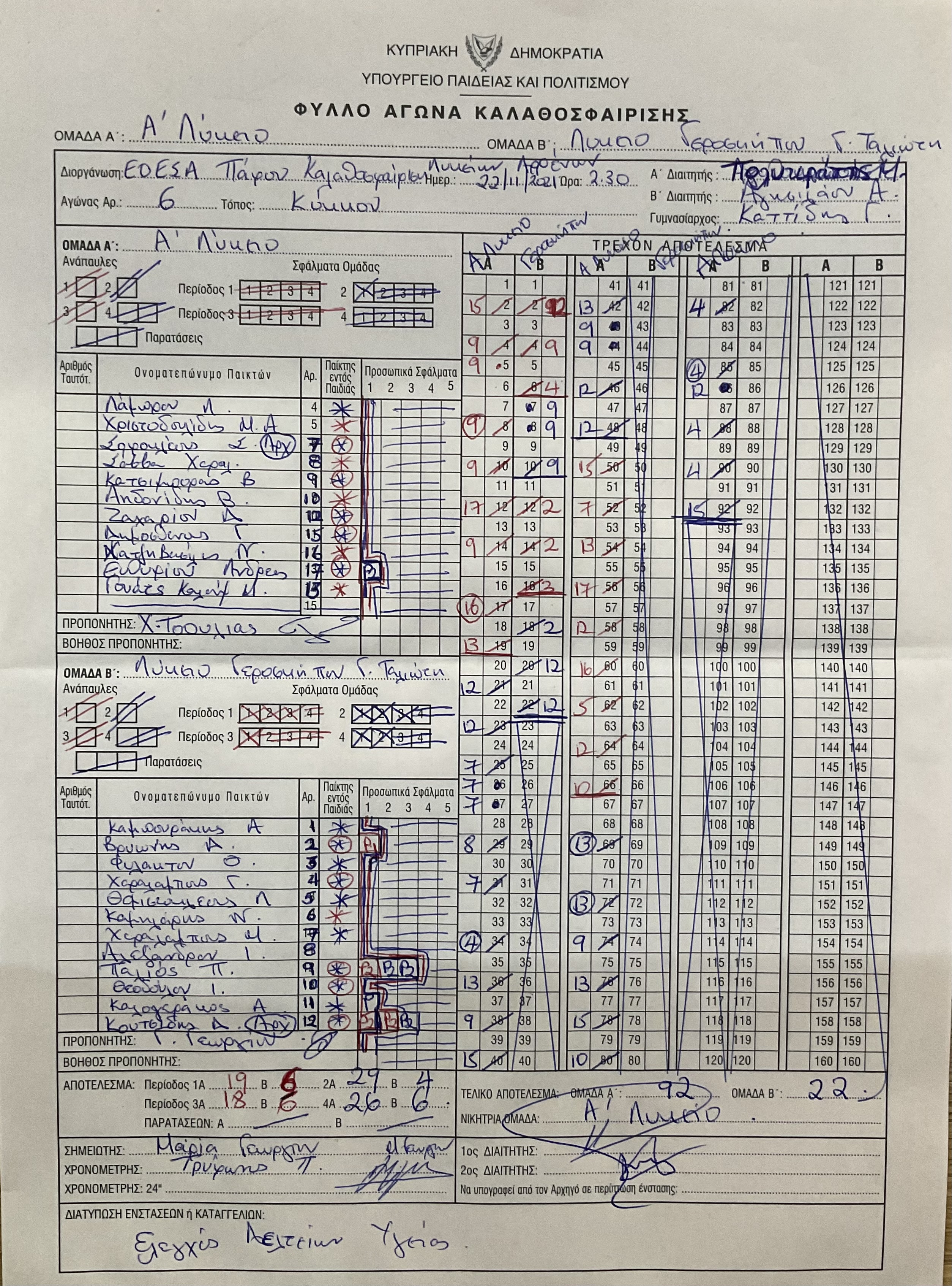 | Παρασκευή 22/11/2019 | Λύκειο Αγ. Νεοφύτου-Λύκειο Έμπας (48-22) |